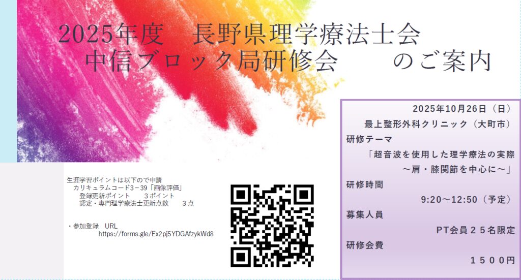 令和7年10月26日(土)、最上整形外科クリニックで開催します令和7年度 中信ブロック局研修会のご案内です。