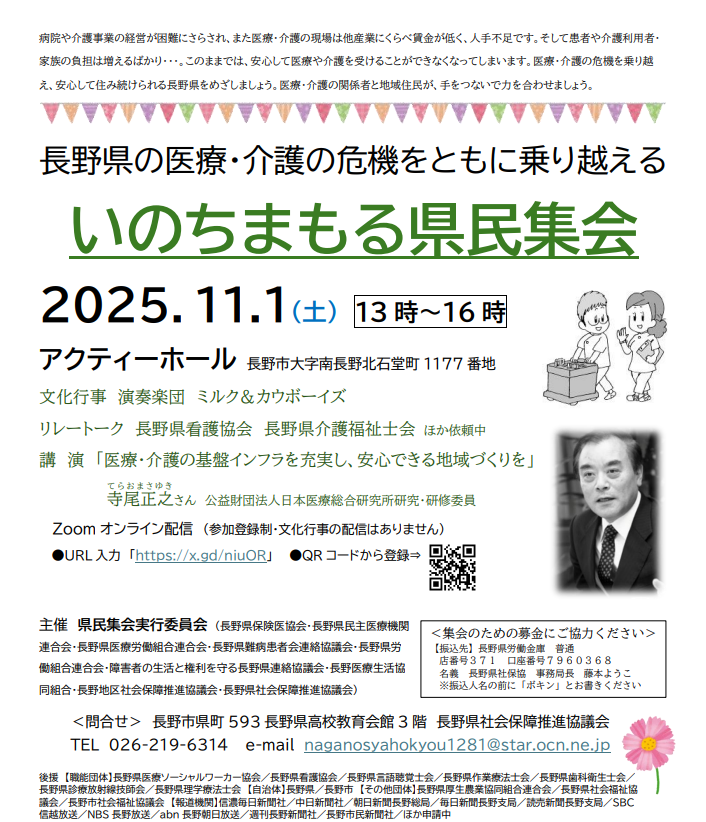 2025年11月1日(土)13時~16時、アクティーホール(長野市大字南長野北石堂町 1177 番地)で開催します「いのちまもる県民集会」のご案内です。