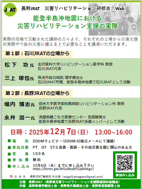 令和7年12月7日(日) 13:00-16:00、オンラインで開催します令和7年度災害リハビリテーション研修会のご案内です。