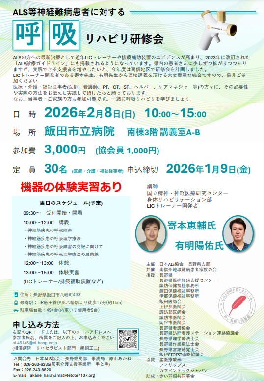 そこで、日本 ALS 協会長野県支部では、県内における呼吸リハビリの普及を目的に、ALS 当事者への診療等で直接関係されている医療・介護・福祉従事者の方々を対象にした研修会を企画いたしました。講師には、呼吸リハビリの第一人者である国立精神・神経医療研究センターの寄本恵輔氏と有明陽佑氏をお招し、神経筋疾患に対する最新の呼吸リハビリについて講義と実技を予定しております。
