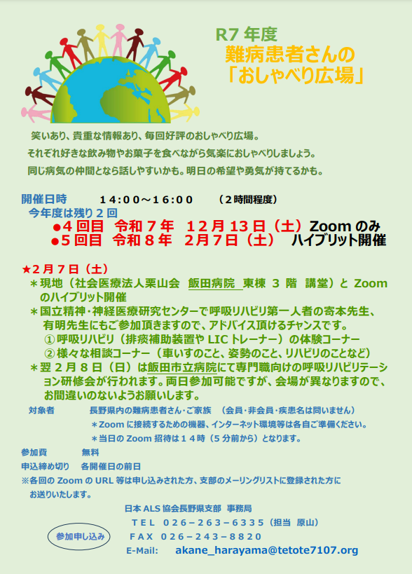 2025年12月13日(土曜)オンラインでの開催、2026年2月7日(土)飯田市立病院およびオンラインにてハイブリッド開催します令和7年度難病患者さんの「おしゃべり広場」のご案内です。
