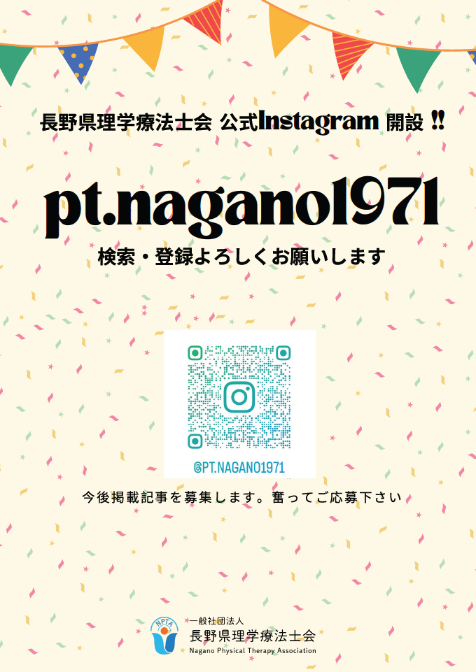 お知らせ 一般社団法人長野県理学療法士会 公式Instagram開設のお知らせ 2025-12-04 ホーム 会員の方へ, お知らせ 一般社団法人長野県理学療法士会 公式Instagram開設のお知らせ 【事務局より】 この度、一般社団法人長野県理学療法士会 公式Instagramを開設いたしました。 是非ともご登録をよろしくお願いいたします。 県士会Instagramダウンロード 前の記事 次の記事