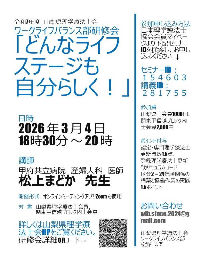 令和8年3月4日(水)、オンラインで開催します「令和7年度 山梨県理学療法士会 ワークライフバランス部研修会」のご案内です。