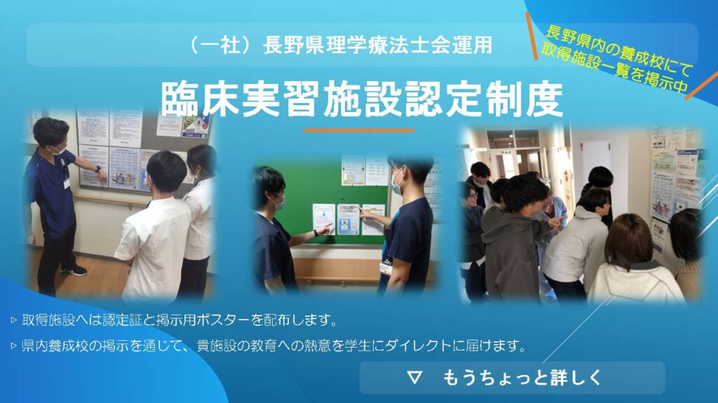 お知らせ 臨床実習施設認定制度のご案内 2026-03-09 ホーム 会員の方へ, お知らせ 臨床実習施設認定制度のご案内 【学術局 教育部 臨床実習施設認定係より】 臨床実習施設認定制度とは時代に即した一定水準の実習教育を実践している施設を長野県理学療法士会が認定する制度です。 TOPページ バナーより「臨床実習施設認定制度」に関する資料がご覧いただけます。 また詳細に関しましては、TOPページ「会員の方へ」→「臨床実習施設認定一覧」より専用ページへリンクしておりますので、そちらも併せてご覧ください。 「臨床実習施設認定一覧」ページはこちらから>>> 前の記事