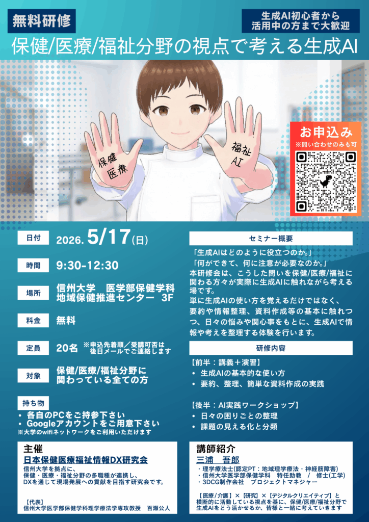 2026年5月17日(日)、信州大学 医学部保健学科 地域保健推進センターで開催します「保健/医療/福祉分野の視点で考える生成AI」研修会(無料)のご案内です。