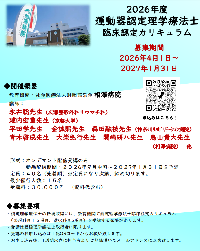 2026年度相澤病院運動器認定理学療法士臨床認定カリキュラム開催のご案内